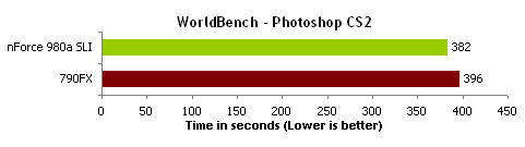 尽管在多媒体编辑和解码测试中得分稍微落后,但是在Photoshop测试中,nForce 980a SLI却要略快于790FX。