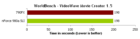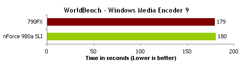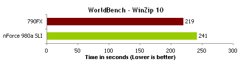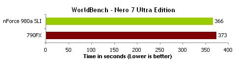 在WinZip测试中,790FX要比nForce 980a SLI 快近20秒。不过在Nero测试中,nForce 980a SLI略快一些。