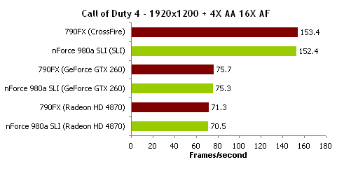 首先让我们讨论一下增幅。这两个平台在除Far Cry 2以外的测试中,均获得了不错的性能提升。比如在Quake Wars中,CrossFire 和 SLI模式下时提升了30%。在Call of Duty测试中,游戏帧速基本上提升了1倍。