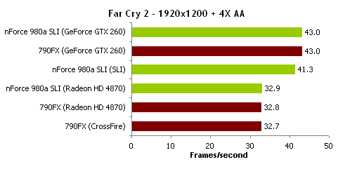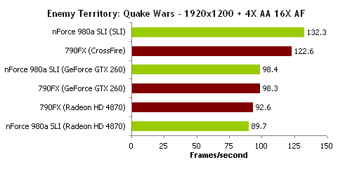 为了了解AMD和NVIDIA在多GPU设置下游戏性能的提升幅度,我们分别对nForce 980a SLI在单块GeForce GTX 260+和SLI模式下,以及790FX在单块Radeon HD 4870和CrossFire配置下进行了测试。在这里大部分的测试中,我们并不关注游戏的绝对帧速值。而在更注意在单块显卡和SLI或CrossFire模式下游戏帧速的增幅。