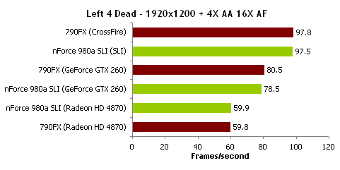 Left 4 Dead的测试结果则比较有趣,因为在这个游戏中CrossFire的增幅要高于SLI。不过这两个平台在这款游戏中均突破了98帧/秒。考虑到单块GeForce显卡要比单块Radeon显卡高20帧左右,因此我们怀疑系统配置的处理器成了SLI配置的瓶颈。