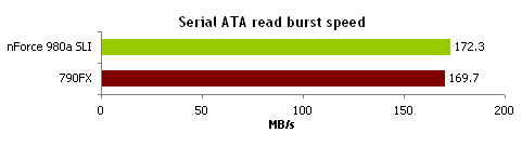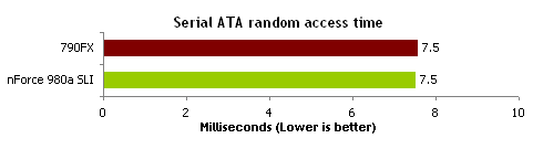 HD Tach显示,790FX在数据传输率方面逊色于nForce 980a SLI,而随机寻道时间则基本一致。