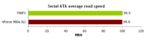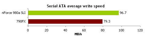 当使用 Vista系统 AHCI驱动时,790FX能够跟上nForce 980a SLI。而当处于IDE模式时,由于这个模式不支持NCQ结果在传输速率上明显偏低。