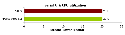 显然nForce 980a SLI在USB传输方面更为出彩,只是CPU占用率相对较高。