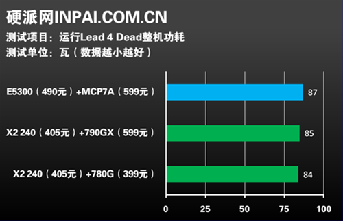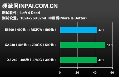 除了整机、应用程序性能测试外,游戏性能的测试是重中之重。从Left 4 Dead的测试成绩来看,AthlonII X2 240+790GX要超出奔腾双核E5300+MCP7A不少,如果是搭配更便宜的780G,那表现就变为一样了。