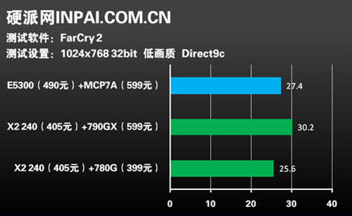 孤岛惊魂2的测试再次凸显出AthlonII X2 240+790GX的优势,超出奔腾双核E5300+MCP7A接近3帧。