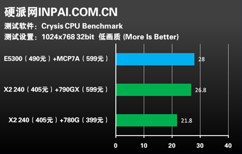 孤岛危机的测试显示奔腾双核E5300+MCP7A成绩最好,AthlonII X2 240+790GX的成绩稍慢一点,不过不算多。