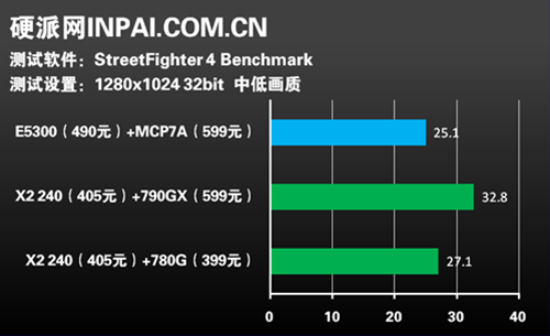 街霸4是新近推出的一款格斗类游戏,所以相信很多朋友也会想知道目前的集成主板能不能玩。我们测试的成绩显示,在中低画质设定下,AthlonII X2 240+790GX可以以超过30FPS的速度比较流畅的运行,如果是搭配780G会稍慢,但也能勉强接受,奔腾双核E5300+MCP7A会再慢一点,不过也能保持在25FPS。