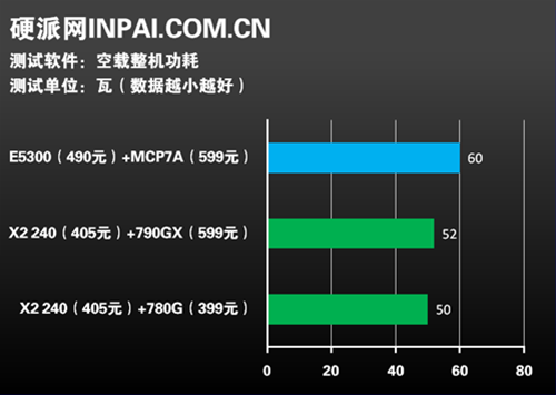 而在游戏这种高负载情况下的功耗测试,三套系统的功耗差距仍旧不大,奔腾双核E5300+MCP7A相对稍高一点,我们分析这和芯片组的功耗有一点关系,MCP7A的功耗可能稍高于790GX。