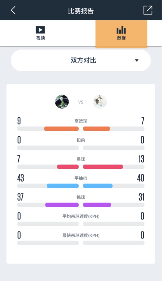 看完了视频,我们再来看数据报告,首先可以看到双方的数据对比。由于没有扣杀,就没有扣杀的相关数据了……