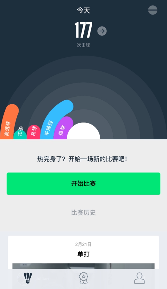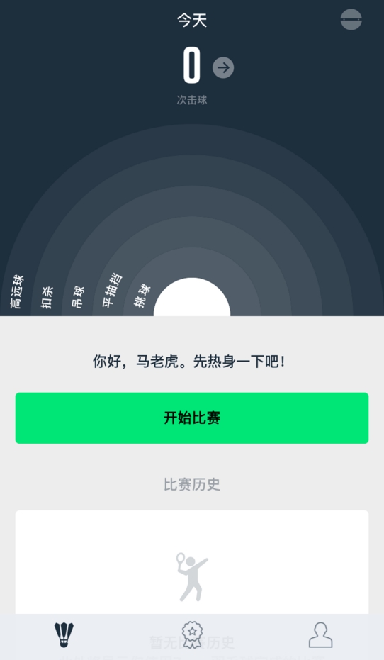 打完以后,回到界面,可以看到今天的总的击球次数,包括比赛和热身、练习时的数据。