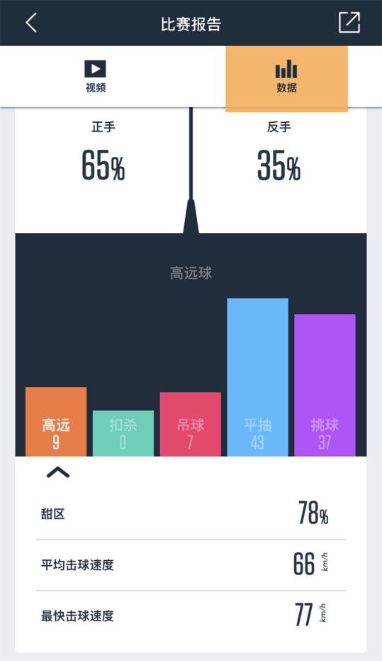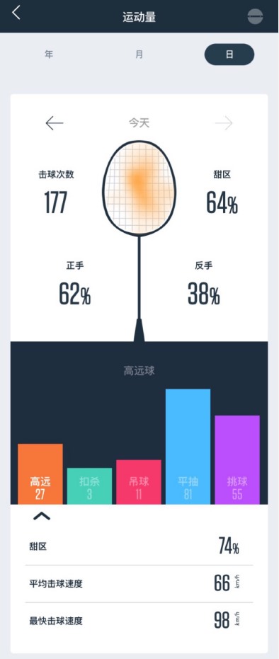 点击击球次数旁边的小箭头,可以看到更详细的数据。点击每种不同的击球类型,还能看到平均、最快击球速度和甜区率。其中,最吸引小编是击球位置的热区图,能直观地看到自己的击球位置,具体每种不同击球的甜区率,也可以帮助羽球爱好者更了解自己的不足在哪里,从而进行更有针对性的训练。