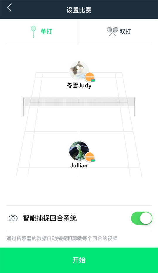 下面,小编将完整体验ZEPP羽毛球的使用流程,为各位提供参考。在首屏,点击开始比赛,可以选择单打或双打模式。本次评测先来看单打模式下的使用。让对手扫码加入,给对手也分配一个传感器,如果对方没有传感器,也可以选择不分配直接开始,本次测试为对手也有传感器的情况,因为小编和同事一人买了一个。打开智能回合捕捉系统按钮,点击开始。