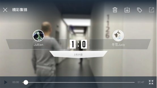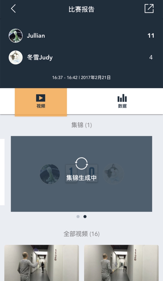 界面一跳转过来,就看到视频集锦正在自动生成了,集锦视频框下面,有比赛全部的单个回合,点击即可回放该回合。本局测试赛,小编与同事妹子一共打了15个回合,但全部回合有16个短视频,识别准确率还是不错的,只有一个用球拍去捡球的动作,被误识别了。
