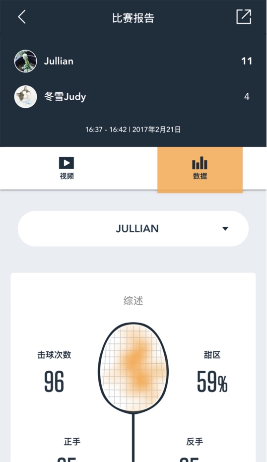 由于受场地限制,小编本场测试赛中没有杀球,所以没有最强杀球回合,这一点上,ZEPP的识别还是蛮准确的,不过遗憾的是,没体验到杀球慢镜头回放的效果。视频的末尾,还有一个本场比赛的数据统计,让视频显得更专业了,感觉自己就像球星一样呢。