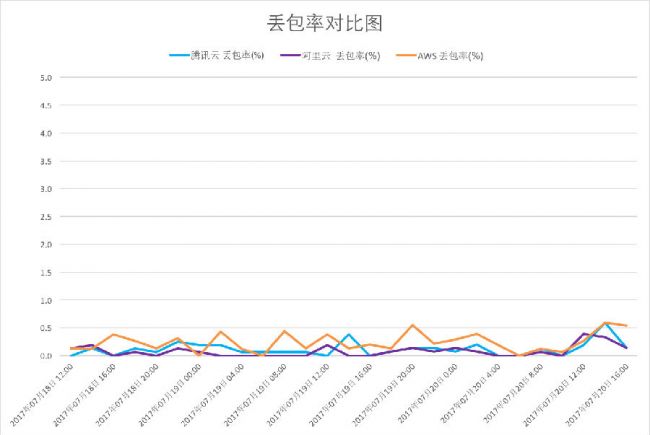 根据测试结果,三家的丢包率都在1%以下,均属于较优水平,其中阿里云稍优(0.08%),腾讯云也较接近(0.12%),AWS稍逊(0.24%)。