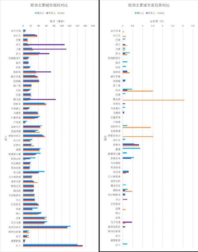 附:阿里云、腾讯云、AWS的法兰克福节点在欧洲各大城市详细测评对比数据: