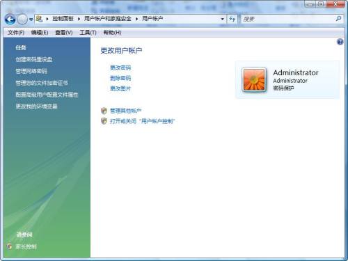 在“开始”菜单中打开“控制面板”,选择“用户账户和家庭安全→用户账户”,打开图4所示的设置窗口。