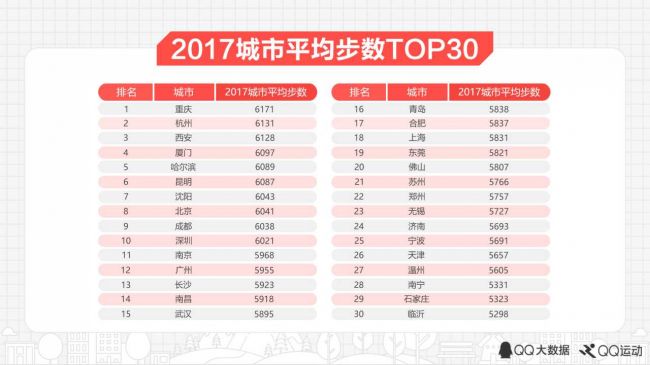 在QQ大数据之《2017中国人运动报告》中,重庆的城市平均步数为6171步,为全国最高。其次是杭州、西安、厦门和哈尔滨,一线城市北京、深圳、广州、上海,分别排在第8、10、12、18位。生活节奏太快,缺乏运动时间,成为一线城市平均步数落后的重要因素之一。