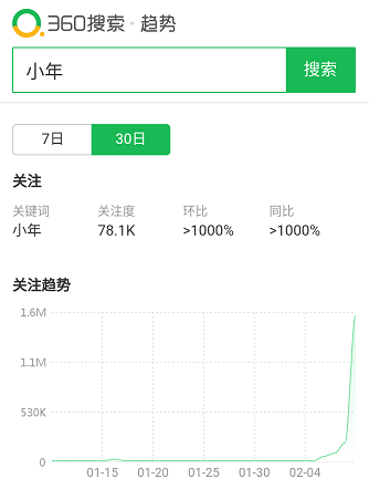 年纪略长的人小年习俗知道的更多一些,年轻人则不然,于是“想过小年,无从下手”成为他们的真实写照。据360趋势显示,小年的关注度在2月8日(腊月二十三)骤然飙升,一度达到156万。