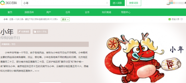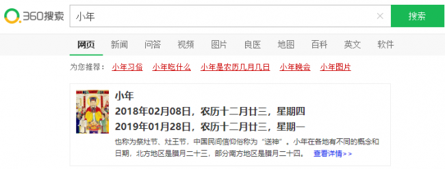 对小年的由来和习俗存有疑问的网友,可在360搜索中输入“小年”进行查询,搜索页最顶端便是360百科,点击进入即能浏览非常详尽的介绍。根据360百科的图文展示可以看到,虽然我国南北方小年在日期和传统食物上不尽相同,但是都有一个共同的习俗,那就是祭灶,而南北方的祭灶方式则大同小异。