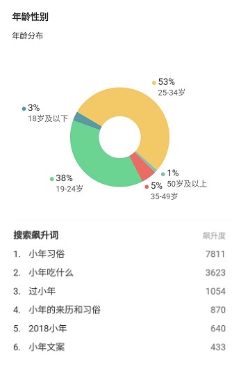 在关注“小年”的庞大群体当中,25—34岁人群占比高达53%,19—24岁人群以38%的占比紧随其后。而从360趋势搜索飙升词中可以看出,网友的关注焦点主要在于“小年习俗”、“过小年吃什么”、“小年的来历和习俗”等。结合以上信息不难看出,80、90后的年轻人对于过小年应该做什么、吃什么普遍存在疑惑。