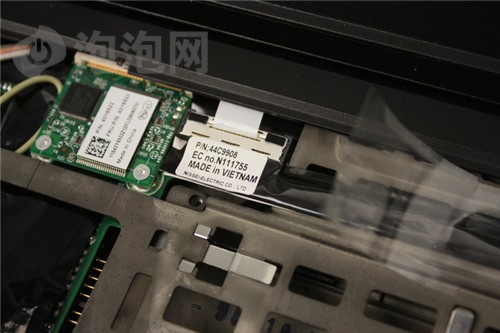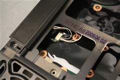 在内存和PCI-E窗口模块内,设计有两个内存插槽和一个标准PCI-E插槽以及一个配备有无线网卡的二分之一版本的PCI-E插槽。同时,我们还可以看到,T400s在Intel 5300无线网卡连接了三根天线之外,还预留有两根空闲。