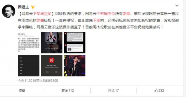 3 月 31 日晚上,网易云音乐突然发布公告,称因版权方要求,不得不很快下架了包括周杰伦在内的杰威尔版权公司旗下的歌曲。并且网易云音乐还顺便推出了购买周杰伦 200 首热门歌曲合辑的链接,售价 400 元,不过目前该专辑购买已下架。
