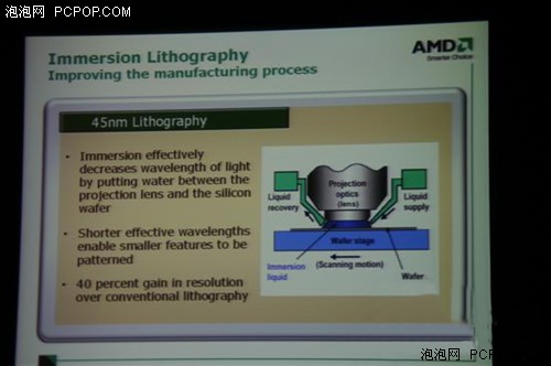 AMD的45纳米制程工艺是联合IBM一同研发的。有趣的是,与英特尔的高-K金属栅极不同,AMD和IBM的技术是超低K电介质互联。而另两项相关技术分别是:多重增强晶体管应变技术和沉浸式平板印刷术。