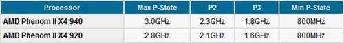 目前AMD Cool‘n’Quiet3.0版本提供了更好更完善的技术支持,曾经CNQ 2.0只支持两种P-State(性能状态),分别是全速和半速,其中后者是倍频减半而来,比如Phenom X4 9950就运行在2.6GHz或者1.3GHz。新版CnQ 3.0将P-State增加到了四种,其一是全速,其二是最低速度800MHz(倍频4x),不管什么型号皆是如此,另外还有两种状态,具体频率视原始主频不同而定。