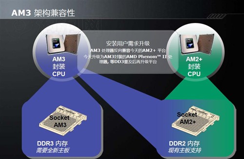 AMD之前的45nm Phenom II处理器以AM2+接口型号Phenom II X4作为先锋军,率先提供了AM2主板的无缝升级计划,但是对于大多数用户来说,新的AM3处理器才是目前的重头戏,在针脚上,AM2/AM2+接口有940针脚,而AM3接口只有938个,比之前少了两针。同时增加了对DDR3内存的支持。兼容性上:AM2处理器可用于AM2/AM2+主板,但不能用于AM3主板;AM2+处理器可用于AM2/AM2+主板(前者需BIOS支持),不能用于AM3主板;但AM3处理器则可用于AM2/AM2+/AM3三种主板(前两者需BIOS支持)——换句话说,3代处理器均向下兼容,不向上兼容,且具体支持情况视板卡厂商的BIOS开发力度而定。