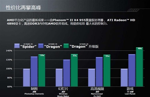 而现在Dragon平台再次由于新AM3处理器的加入进化成了新“Dragon”平台,相比之前的45nm PhenomII处理器+AM2+主板+ATI 4870显卡组合,新的龙平台又加以改进,性能再一次得到了升级,AM3处理器+AM3主板+ATI HD4890显卡,再搭配上DDR3内存,全新一代的Dragon平台将AMD平台的性能达到了新的顶峰。