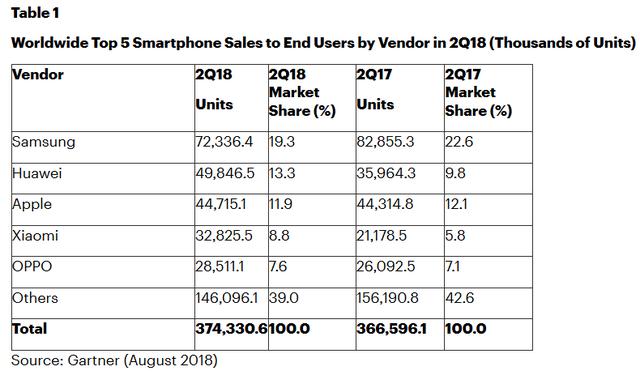 Gartner的最新数据中,2018年第二季度华为首次超过苹果,成为全球第二大智能手机供应商。苹果则退居第三位。