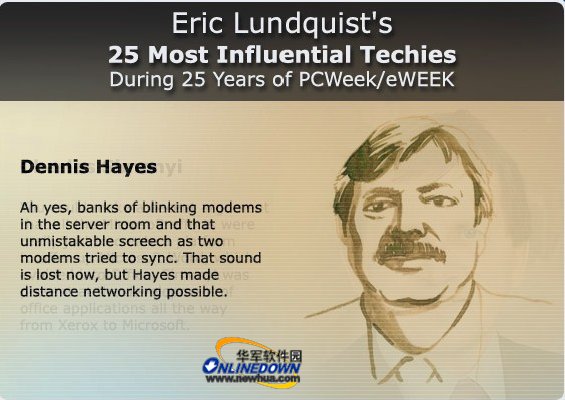 海斯运用DOS系统测试AT指令成功连接了世界上第一台Modem。没有他,我们可能到现在还不知道互联网是什么样子。Dennis Hayes爱好中国文化,不但取了中文名字,还娶了中国宁波人为妻子。