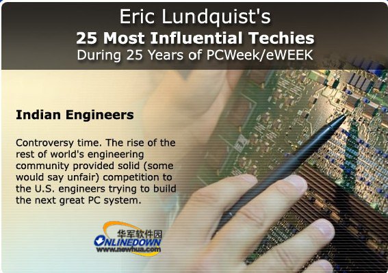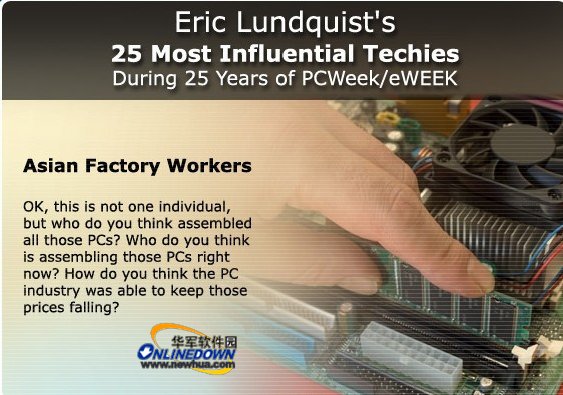 据国外媒体报道,本周四是西方的传统节日感恩节。为此,资讯网站Eweek评选了近25年来,对IT业的发展产生过巨大影响的25位人物。准确的说,评比的对象并不仅仅指个人,亚洲IT工人也作为贡献者名列其中:
