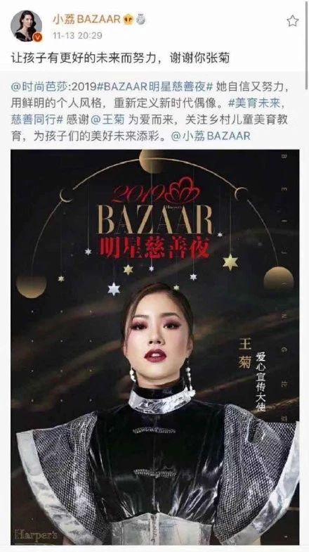 昨晚,《时尚芭莎》执行出版人兼主编沙小荔在转发芭莎慈善夜王菊宣传微博时,打出了“谢谢你,张菊”,总共就俩字儿,还说错一个……