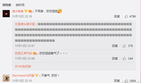 不过好在王菊粉丝没那么暴力,没有“血洗”沙小荔微博,反而整齐划一地在评论区回复:“不用谢,苏芒姐”。