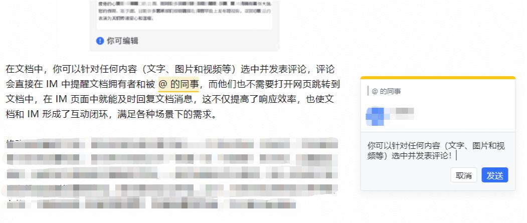 在文档中,你可以针对任何内容(文字、图片和视频等)选中并发表评论,相关评论会直接在 IM 中提醒文档拥有者和被 @ 的同事,而他们只需要打开 IM 页面,就能及时回复文档消息,这不仅提高了响应效率,也使文档和 IM 形成了互动闭环,满足各种场景下的需求。