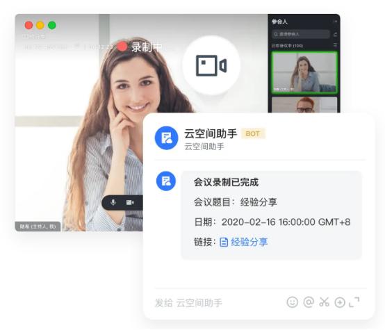 值得一提的是,其中的“实时云端录制”功能,主持人可以实时录制会议音频及视频。录制内容将会自动保存在云端,并通过飞书机器人向所有参会人推送会议主题、日期和录制文件链接,方便了后续的回顾和会议内容梳理。