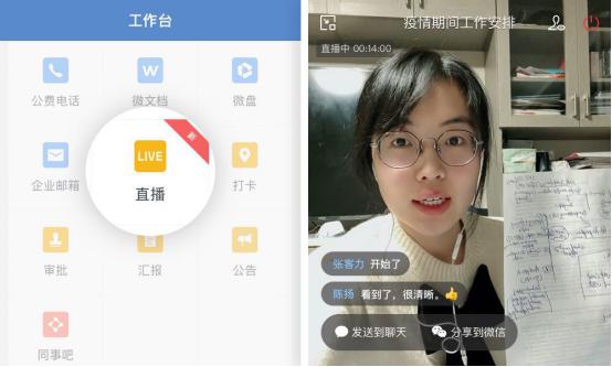 企业微信是腾讯公司基于微信针对企业所需要功能打造的办公软件,通过微信号即可登陆,主打一个微信号可以游走个人与工作之间。支持发红包、视频会议、微盘联动和云端文档演示等功能。用户可以内置“工作台”开启视频直播,邀请链接可以转发至微信,直播时支持显示群昵称,增加了远程办公软件在线沟通的互动性。