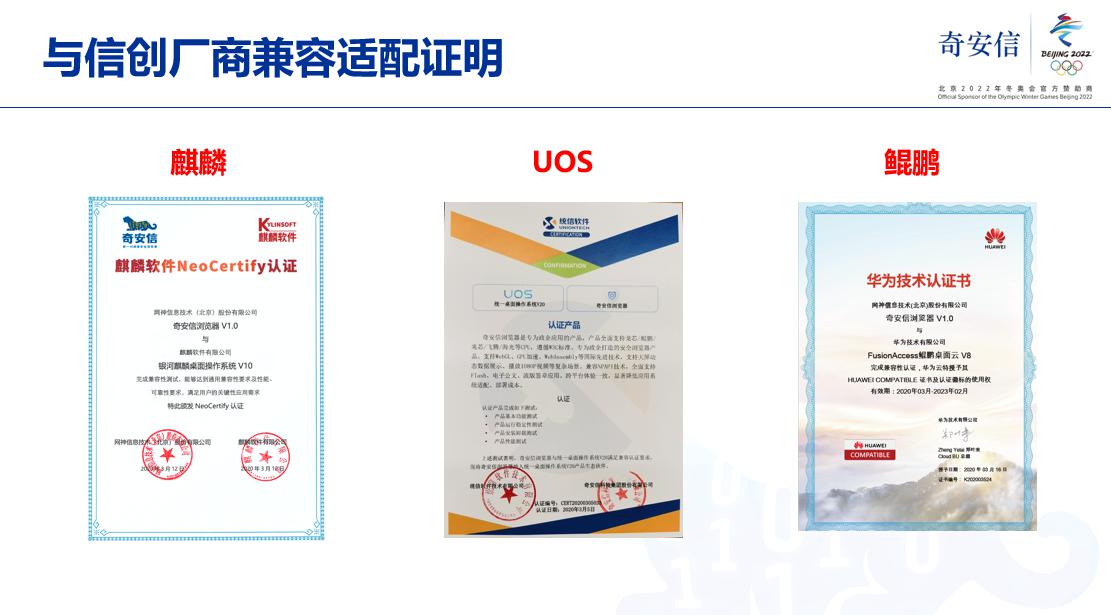 另据了解,目前奇安信可信浏览器已和金山、永中、数科、书生、福昕等上百款信创应用、中间件及打印机完成产品适配,未来还将适配iOS、安卓等移动端操作系统。