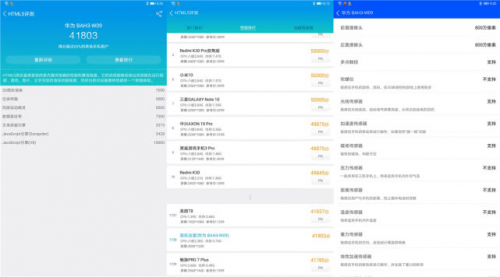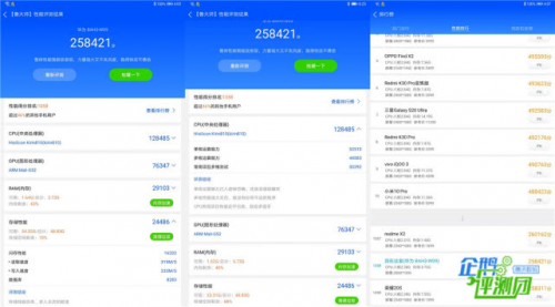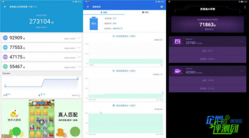 分别使用鲁大师和安兔兔两款软件对MatePad进行跑分测试。可以看出,搭载麒麟810处理器的MatePad整体性能与荣耀20S相当,AI性能与荣耀Play 4T相当,HTML 5跑分基本在魅族Pro 7 Plus的水平,而整体性能体验和一加7T差不多。可以看出MatePad目前尽管在性能上处于中端水平,但是整体体验还是非常不错的。