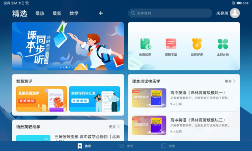 首次使用华为教育中心,系统会询问用户的学段和学习科目,之后进入专属学习桌面,系统会自动精准匹配相对应的课程和资源。在桌面点开“推荐”,会发现系统以专题形式推荐了大量课程。