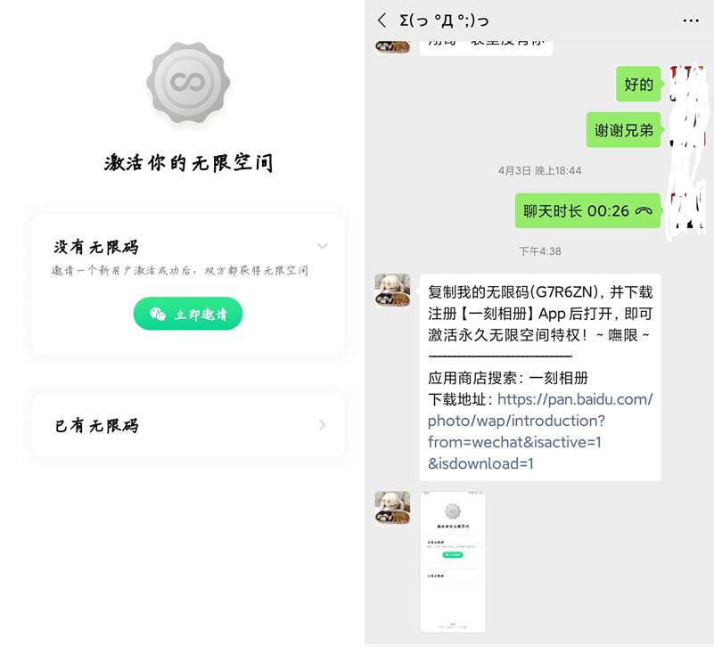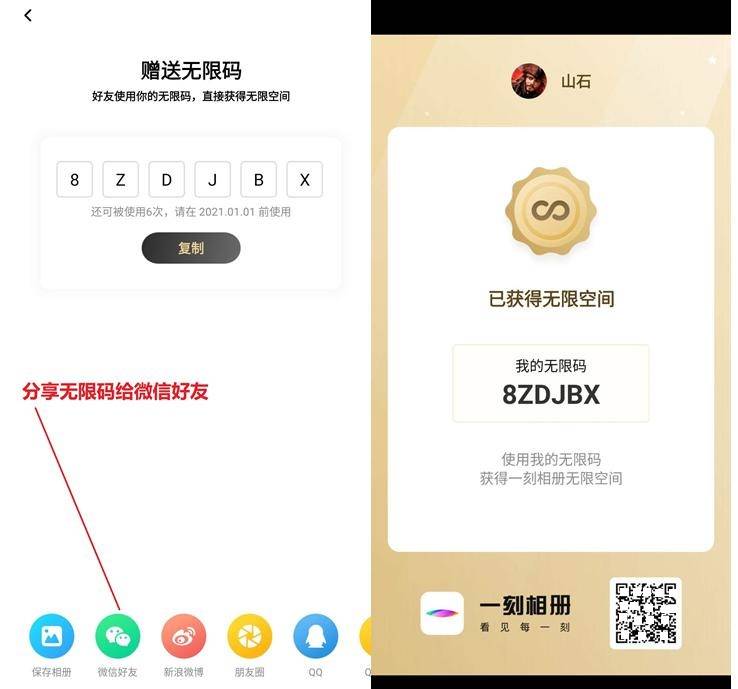 如果叔叔阿姨们在开通无限空间后依旧想分享好福利给身边的同伴们,一刻相册也人性化地理解大家想要分享的心情,支持赠送最多6位好友无限码。把自己的无限码分享给6位好友,好友下载一刻相册后输入无限码,就可以也得到无限空间。