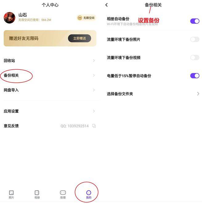 另外小编还有一个温馨提醒,在免费获得无限空间后,点击“我的”页面的“备份相关”,即可设置自动备份。在这里,建议大家开通WIFI环境下的“相册自动备份”。这样一来,相册便不会随意耗费4G流量,而在WIFI环境下,手机中所有的照片将自动备份到一刻相册。
