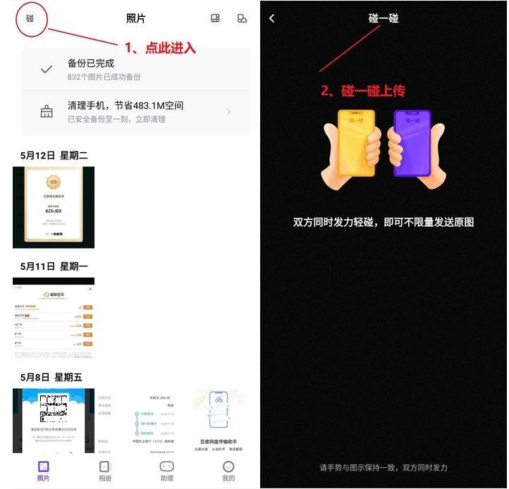 除此之外,一刻相册还为老年人提供了非常贴心的便捷功能,跳完广场舞后,叔叔阿姨们彼此之间的交流、点评和调侃自然也少不了。这个时候,一刻相册的“碰一碰”功能就格外方便了,只需打开蓝牙,晃动手机,即可完成照片的即时互传。