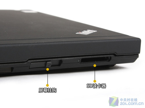 联想ThinkPad系列笔记本通常都会采用屏钩的方式把笔记本屏幕固定住,这款机器也不列外,其机身前侧靠右的位置设计了了一个屏钩,用户使用时可以非常方便的开启屏幕,并且旁边还安排了一个读卡器接口。