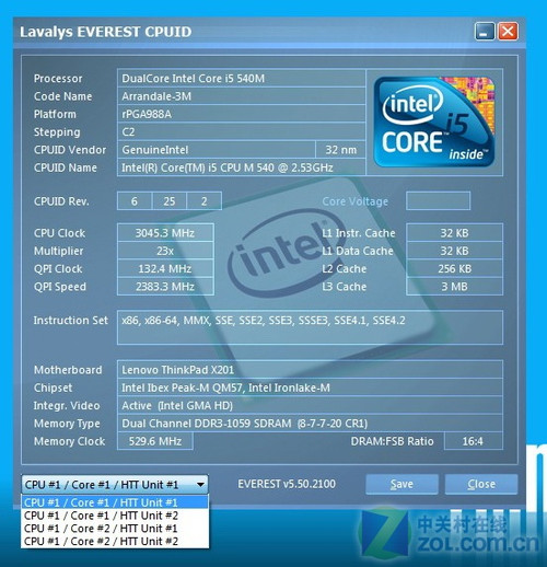 通过CPUID的测试截图我们可以了解到这款处理器的详细配置,这款酷睿i5- 540M拥有2.53GHz的标准主频,睿频之后可以达到3.06GHz,并且它还配置了3MB的三级缓存和SSE4.2指令集。