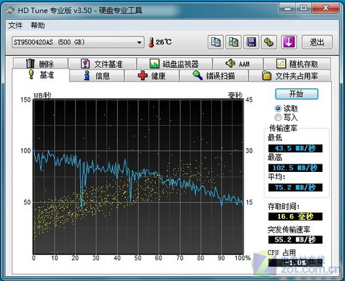 这款机器配置了一块500GB的希捷硬盘,通过HD Tune的测试我们看到,硬盘的平均读取速度为75.2MB/秒,成绩还是非常不错的。