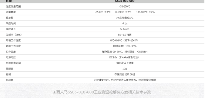 针对工业测温枪对远距离测温的需求,西人马研发团队在工业测温枪前端安装了带有透镜的套筒,保证了能够进行远距离测温,西人马工业测温枪的物距比为10:1。另外,西人马团队通过进行软件设置,将发射率设置为0.1~1.0可调,满足了不同工业场景中的测温需求。同时,西人马提供常用材料发射率表,客户根据被测物体选择对应发射率即可。